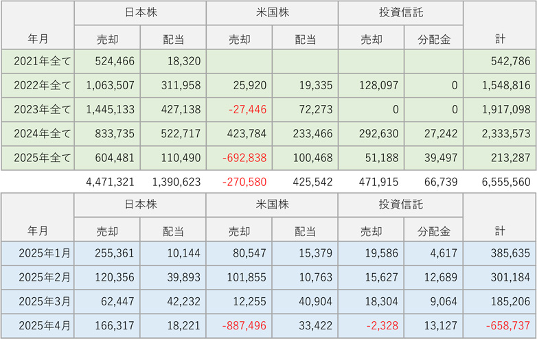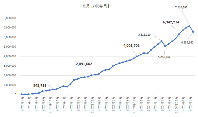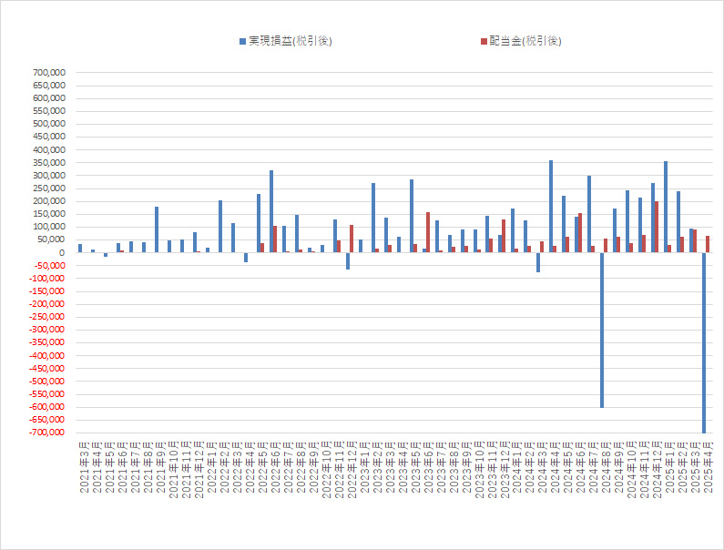 2025年4月度の確定利益は -658,737 円でした。(※源泉徴収後)