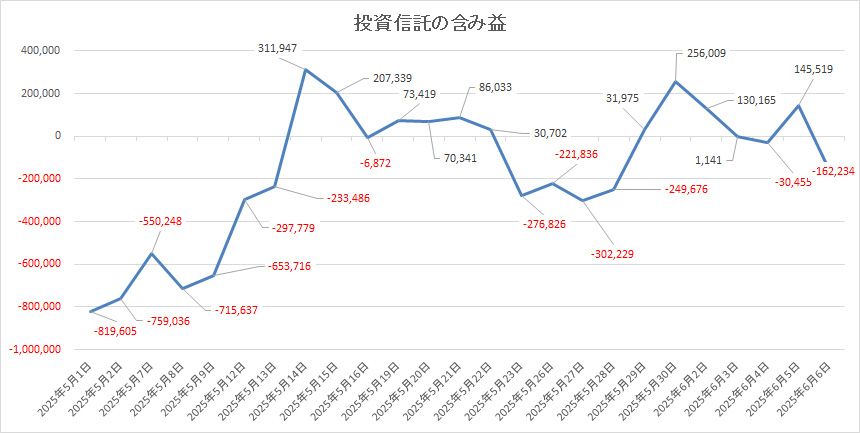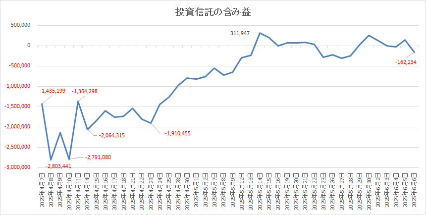 大暴落日の4月7日から相場が落ち着いてきた6月6日までの投資信託の含み損益をグラフにしてみました。