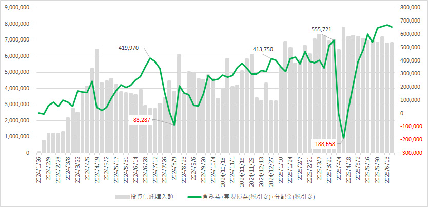 2024年8月、2025年4月の暴落の影響が大きくて、利益率が大きく下がっています。