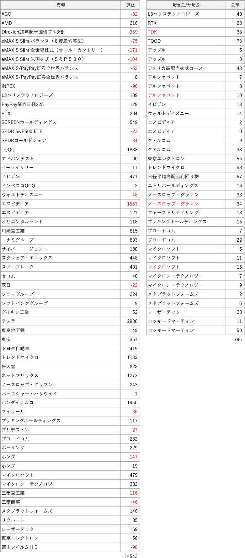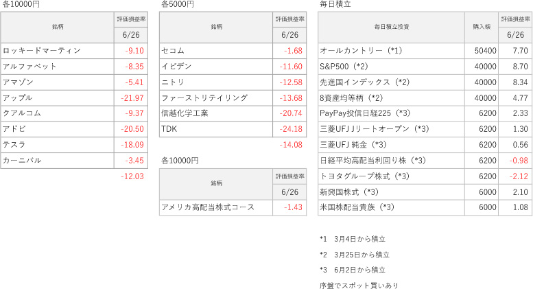 投資信託の資金確保のために1月から3月の下落局面で売却した米国株と日本株でいくつか損失出していますが、トータルではプラスです。