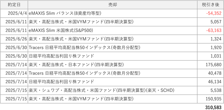 「楽天・高配当株式・米国VYMファンド(四半期決算型)」の権利取りを跨いで権利落ち日に全売りしているため、売却益も分配金も得ています。個別株とかETFのような権利落ち日に不条理な大きな下落というものは投資信託にはないので、少しでも早く資金を確保したければ権利跨ぎせずに売却、分配金名目の収入が欲しければ権利跨ぎしてから売却で良いです。