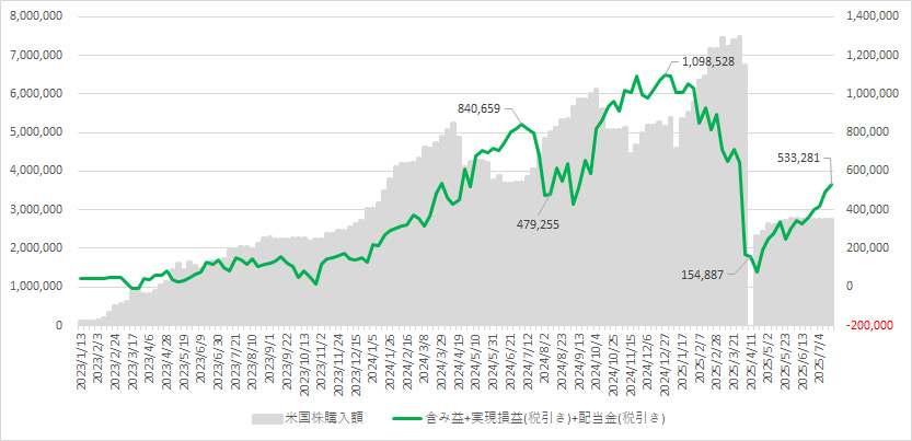 実現損益(累積):+4,932,553 円 先週比 +8,569 円 ※税引き後