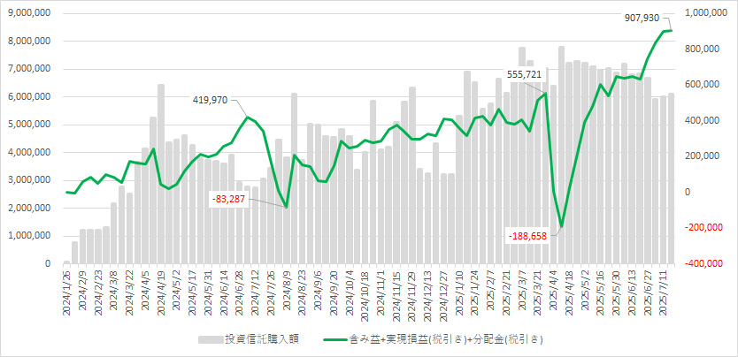 完全長期目的だった「退職金運用枠」ですが、爆買いしたタイミングが最悪でした。当初は半年くらい掛けてゆっくり構築するつもりが、トランプ相場で下落基調になり「ここで爆買いすれば爆益のはず」と思い込んで、結果的に大暴落で大惨事でした。あれこれいじくって戻りを待っても、プラス10%には達しそうもなく、夏枯れ相場で再び大きく下がることがあれば、ここでいったんリセットして買いなおせば良いと開き直ったわけです。