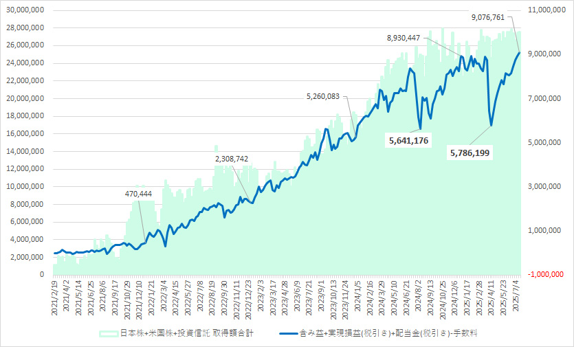 日本株+米国株+投資信託の推移グラフ(週)