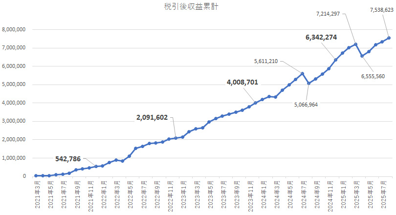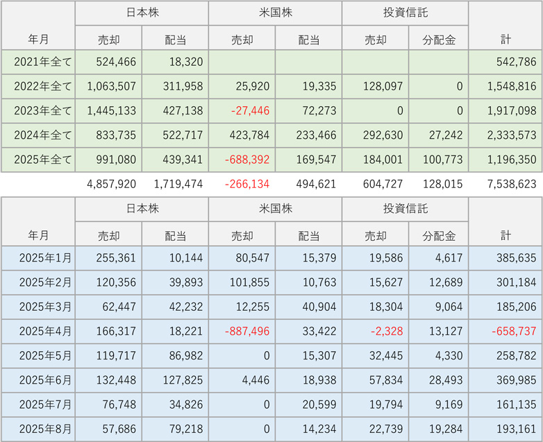 2025年8月度の確定利益は +193,161 円でした。(※源泉徴収後)