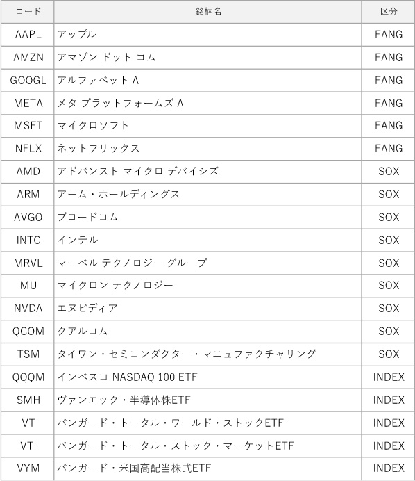 問題は「どれを残すのか」ですが、しばらくは「半導体&AI」銘柄が主役のはずですので、FANG+銘柄とSOX銘柄から選びます。