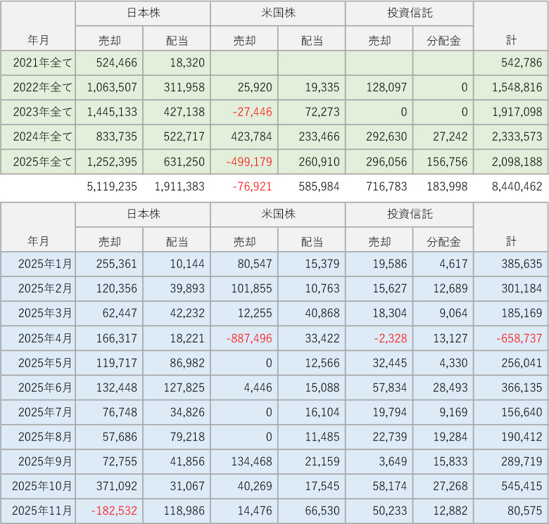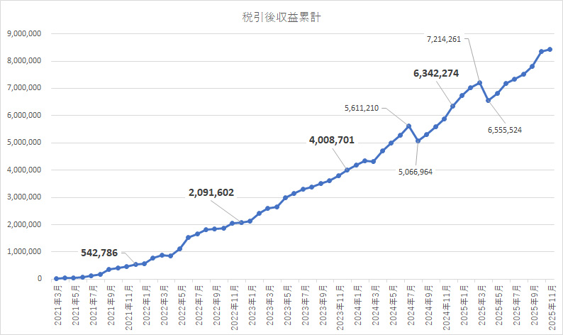 2025年11月度の確定利益は +80,575 円でした。(※源泉徴収後)