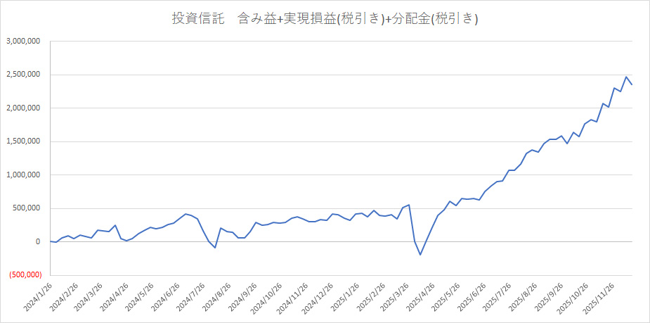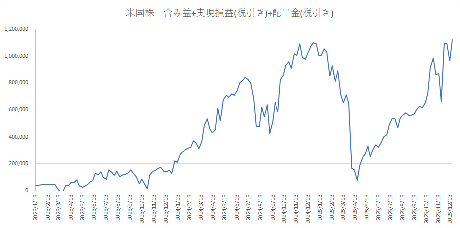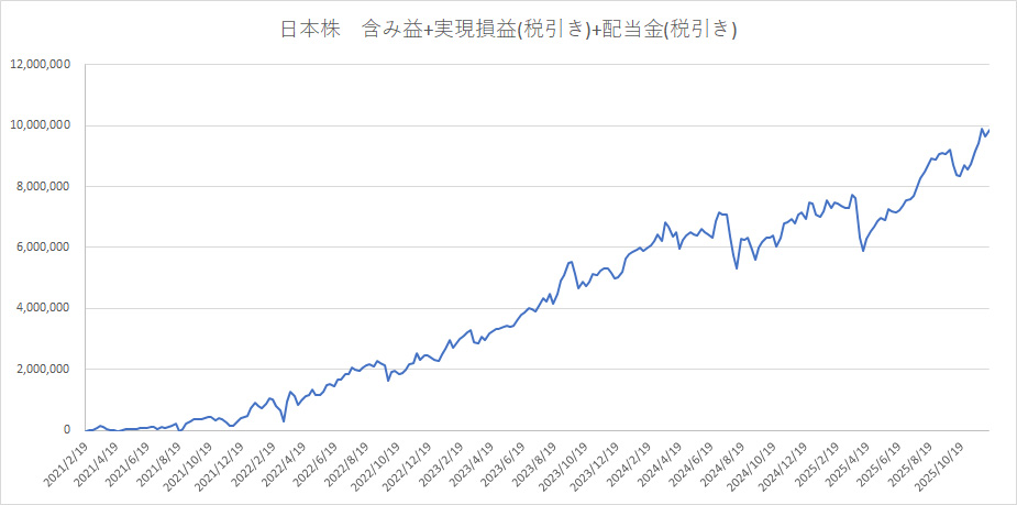 2025年は微妙な上げ下げで始まり、利益を得る前に4月の暴落が来たため実質マイナスで始まった1年でした。暴落から回復した後も日本株の急騰が止まらず、夏枯れ相場で急落が来ることを予想して日経インバとダブルインバで総額700万円ほど買ったことでさらなる損失が膨らみました。2022年のように1年中スイングするような相場なら利益を得やすいのですが、1本調子で上昇していく相場ではスイング売買の難易度が高まります。