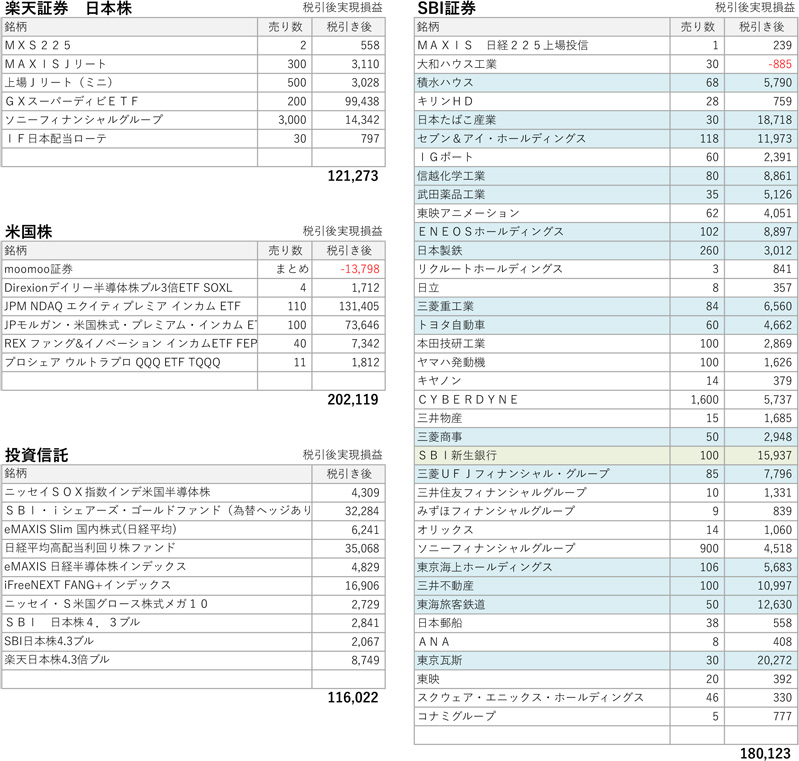 SBI証券側で年末相場用に10月中旬からコツコツ買ってきた銘柄を12月の最初の週で売却しました。セルを青色背景にしてある15銘柄で税引き後133,924円の利益でした。今までの“週トレ”の場合は利益が+2%前後で利確していましたが、2か月から3か月程度は利益を伸ばした方が良いのかもしれません。しかし、ソニーGや任天堂のようにあっという間に下落して含み益がなくなり、大きな含み損を抱える銘柄もあるため、利確のタイミングは相変わらず難しいです。