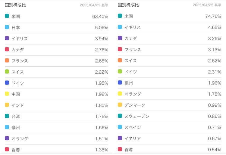 オルカンは米国株を約63%含まれ、日本株を僅か5%しか含みません。日本株を中途半端に含んでいるとも言えます。先進国株(除く日本)は米国株を約75%含んでいるため、「先進国株(除く日本)+α」で考えるとバランス型PFを組みやすいかもしれません。