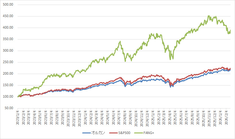 オルカンとS&P500の上昇はFANG+の爆上げによるものだと分かります。2025年末からのFANG+の下落の影響でS&P500は不調ですが、オルカンのダメージは極わずかです。