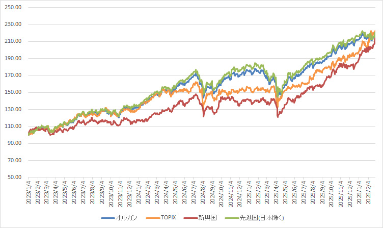オルカン、TOPIX、新興国株、先進国株(除く日本)