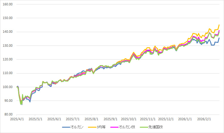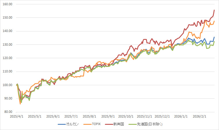 オルカン、TOPIX、先進国株(除く日本)の3本は2025年末までは似たような動きをしていますが、2026年2月に入るとTOPIXがいっきに上昇しています。新興国株は途中に2か月間ほどの停滞期間がありますが、それを抜けると大きく上昇しています。