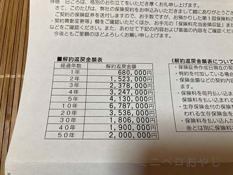 せめて毎年40万円なら最大限妥協しますが、困ったものです。これはもう解約するかと書類を見てみると、よくわからない「解約返戻金額表」があります。どういう計算なのかさっぱり分かりません。
