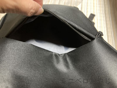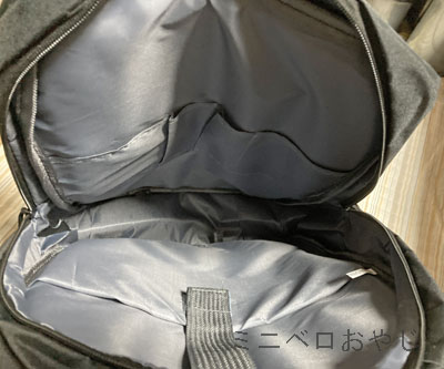 「いかにも安く作りました」が伝わってきますが、機能面は十分に果たしています。ノートPCを入れるスペースが確保されています。小物を入れるポケットもあります。
