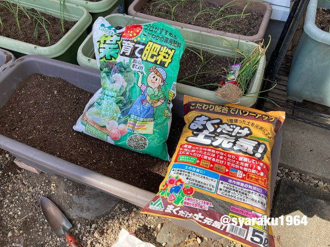 プランターの土をローテーションして、土を再生する肥料とたまねぎの肥料を使います。