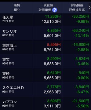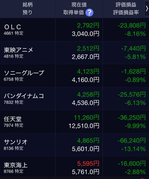 エンタメ銘柄の含み損が酷いけど持ち越しかな。