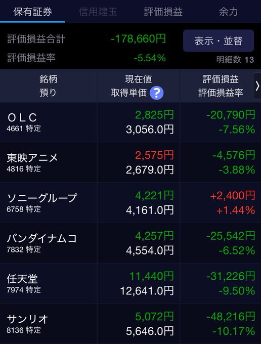 エンタメ枠の5銘柄を100株まで買うと約200万円。含み損が酷すぎるけど楽天証券へ移管させて放置かな。再びエンタメ銘柄のターンが来るはず。