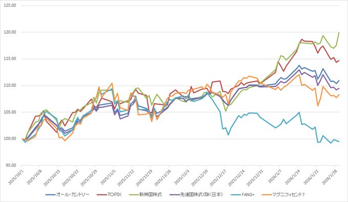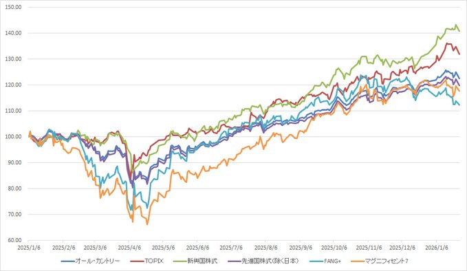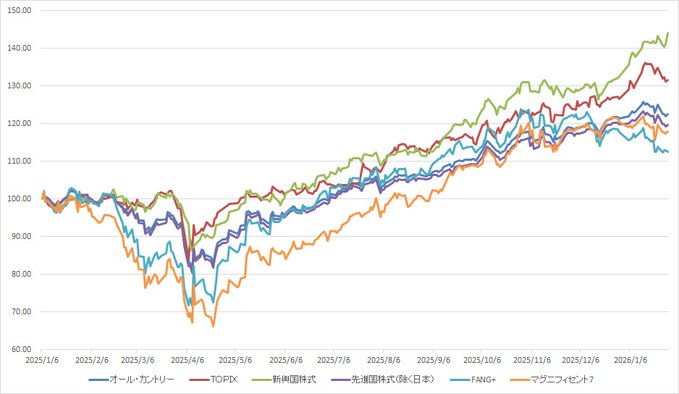 途中までは新興国株とTOPIXが接戦だったけど、1月20日以降は新興国株が優位。