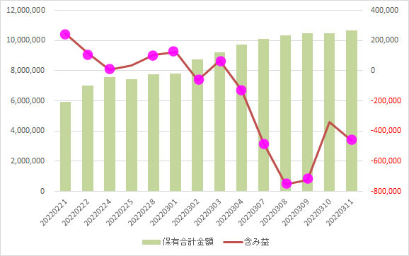 連日のポチポチで600万円だった投資額が1000万円超になっていたため、含み損が大爆発していました。