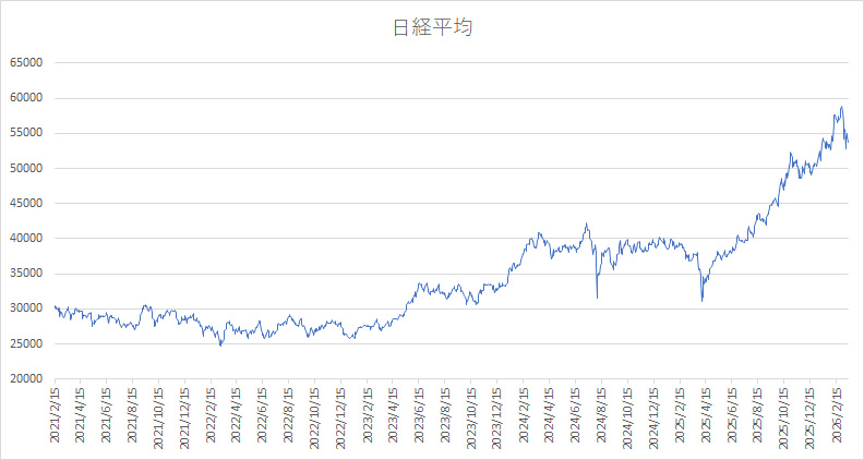 終値ベースの直近の高値は2月27日の58850.27円、安値は3月9月の52728.72円で、マイナス10.31%です。