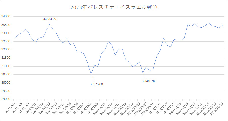 そこで、「2023年パレスチナ・イスラエル戦争」の時の日経平均の推移を見てみます。